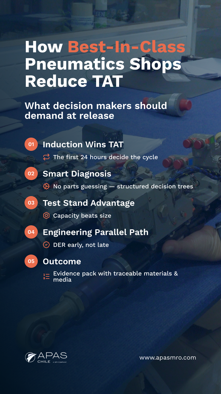 High-performing MRO programs do not treat pneumatics as generic components. They manage them through structured processes that combine disciplined induction, standardized troubleshooting, engineering judgment, and robust test capability—ideally within an in-house or tightly integrated accessory shop.